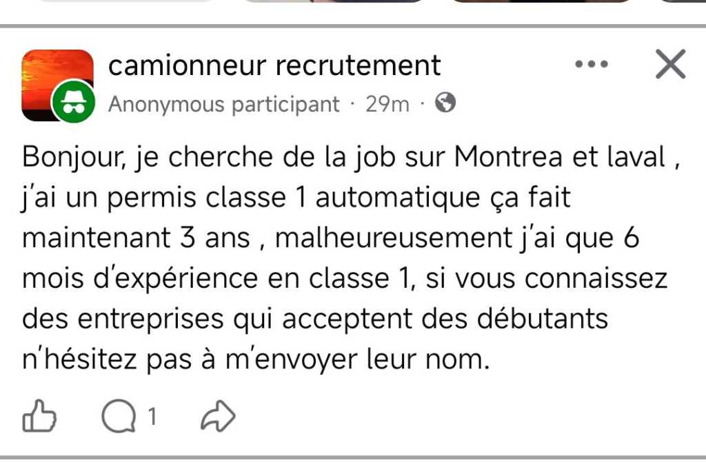 “Hello, I’m looking for work in Montreal and Laval. I’ve had an automatic Class 1 license for three years now. Unfortunately, I only have six months of Class 1 experience.”